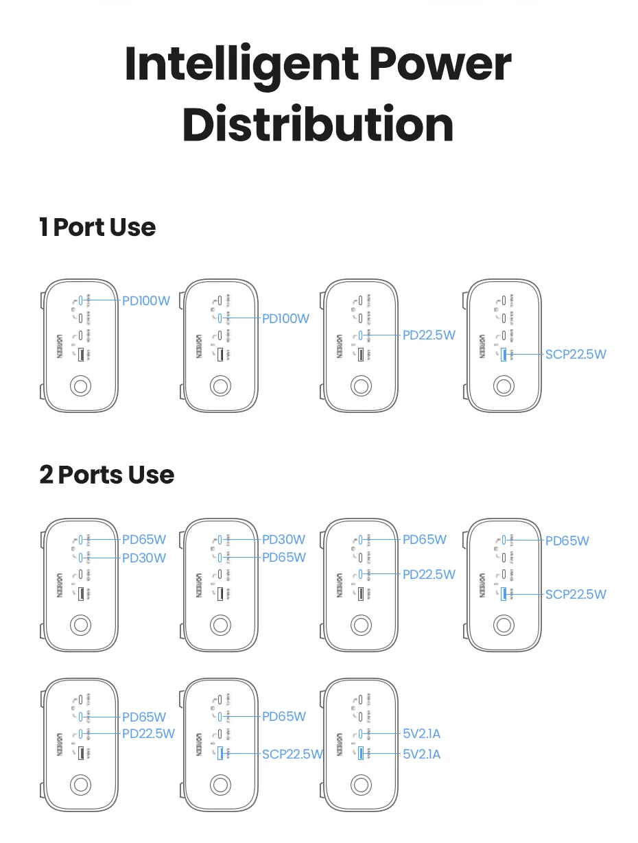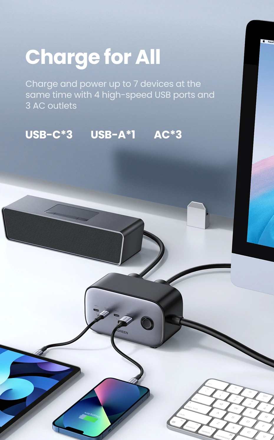With 3 USB-C ports, 1 USB-A port and 2 AC outlets (1875W/15A), Ugreen 100W Charging Station can charge up to 6 devices at the same time and provide a clutter-free desktop.
