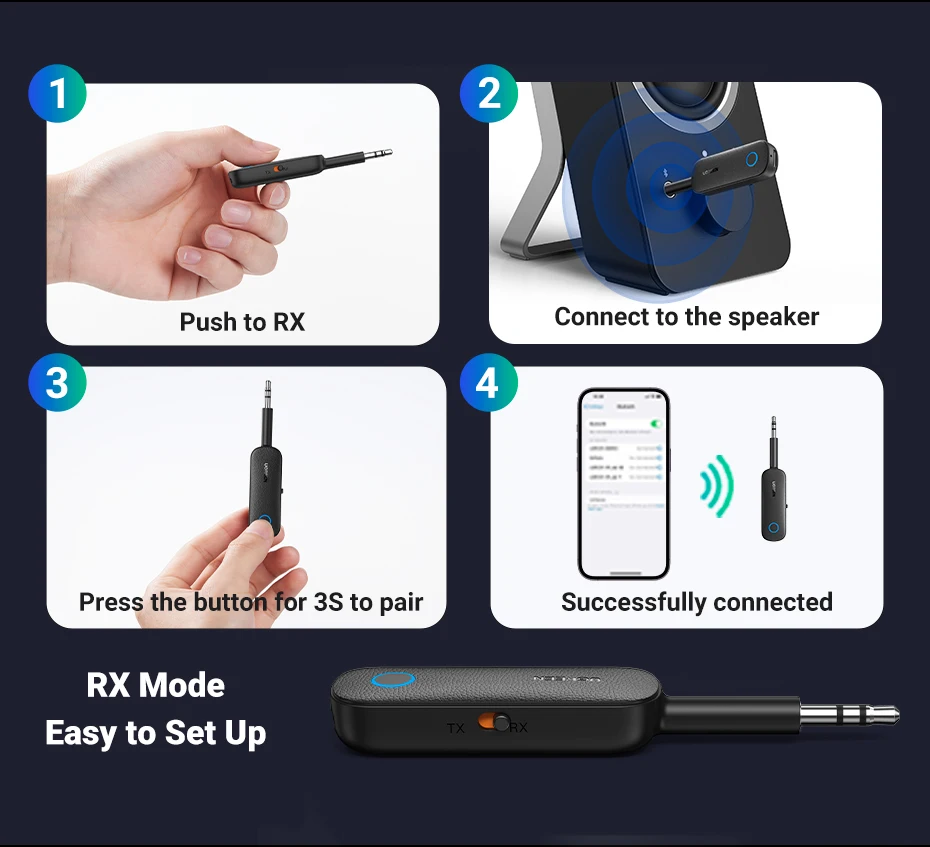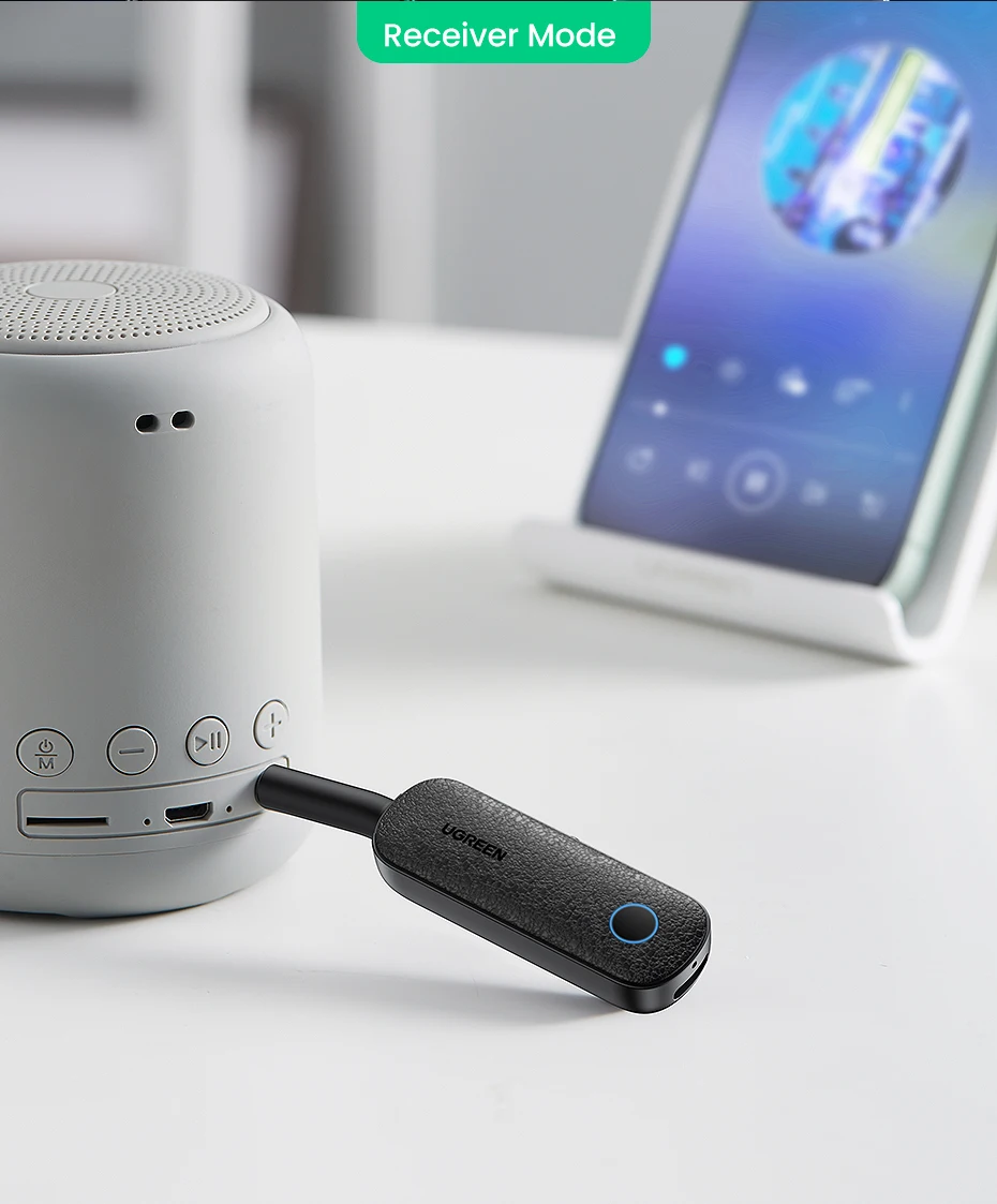 Connect to speaker or car audio system, immerse yourself in HiFi Music. The product allows you to transform non-Bluetooth stereo devices (including speakers, home theaters, car stereos, etc.) into Bluetooth-enabled devices. Just connect the product to your old devices and enjoy the high-quality sound from wireless speakers.Transmitter Mode
