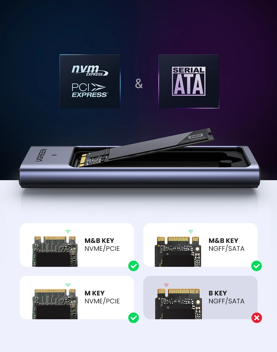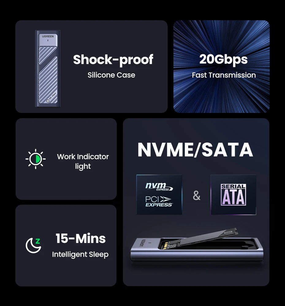 UGREEN 20Gbps M2 SSD Case M.2 NVMe SATA SSD Enclosure Adapter USB 3.2 Gen2 External Enclosure Supports M and B&M Keys