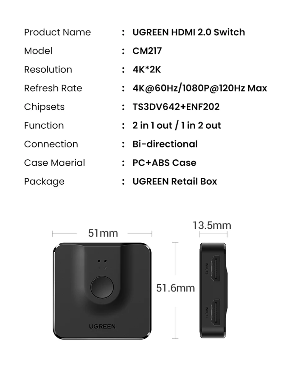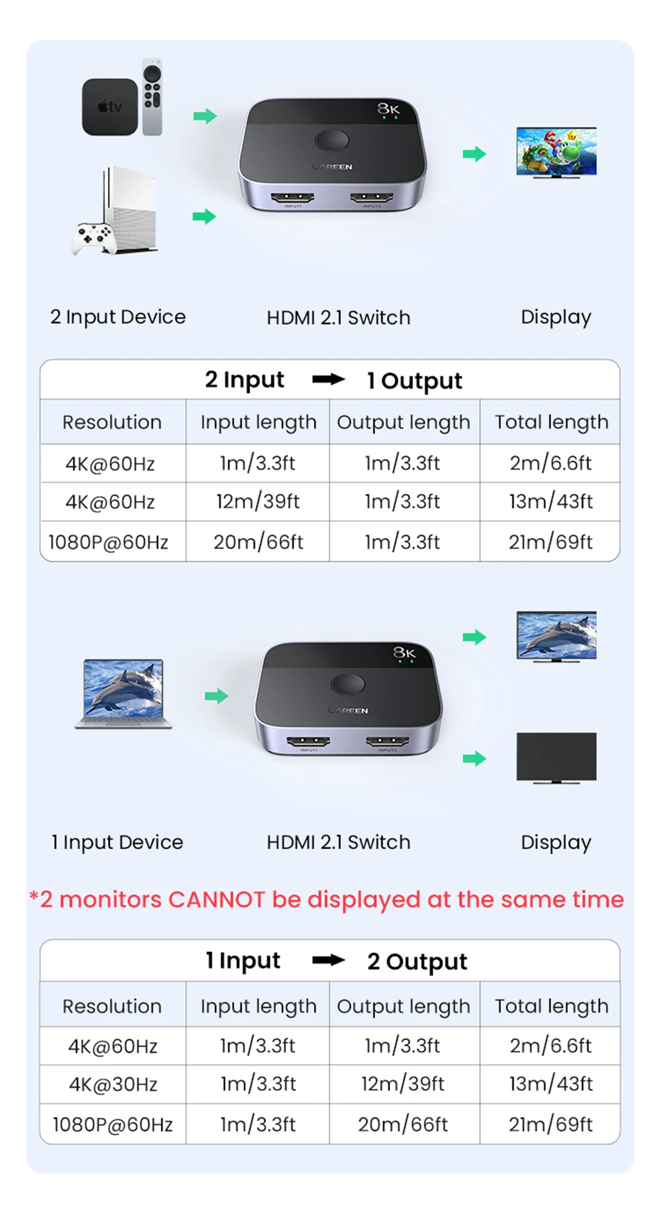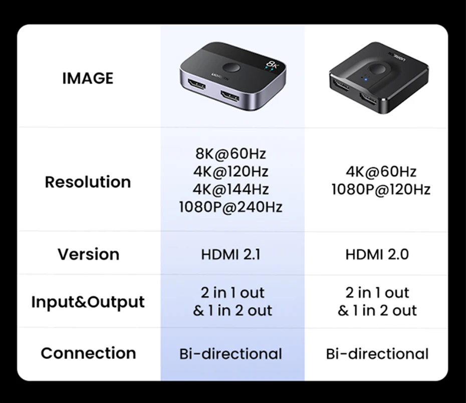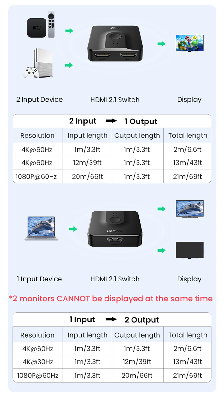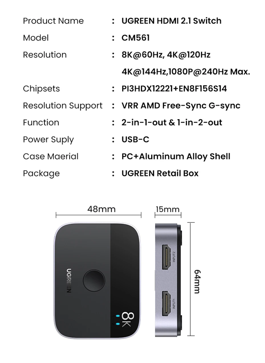 UGREEN HDMI 2.1 Splitter Switch 8K 60Hz 4K120Hz 2 in 1 out for TV Xiaomi Xbox Series X PS5 HDMI-compatible Monitor HDMI Switcher