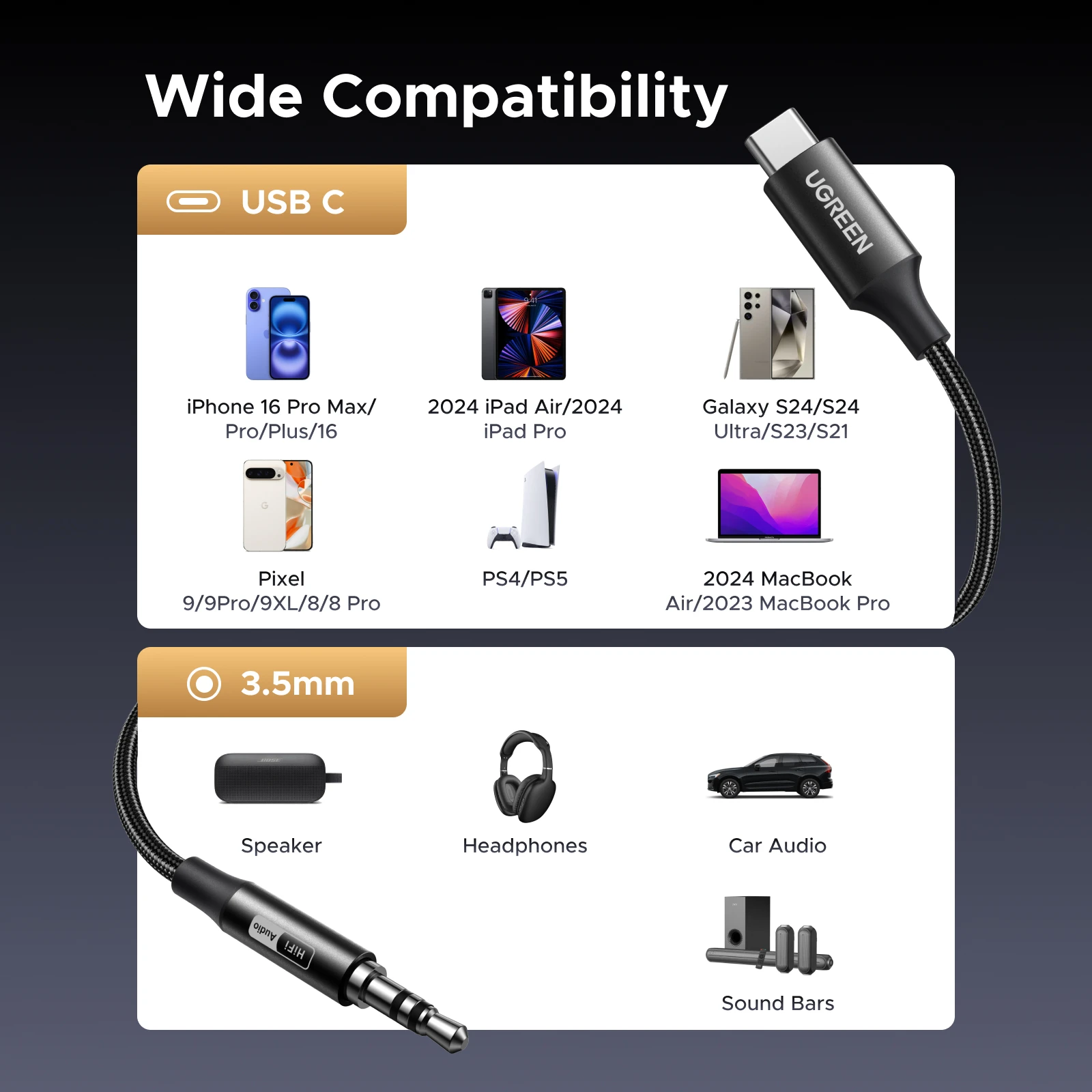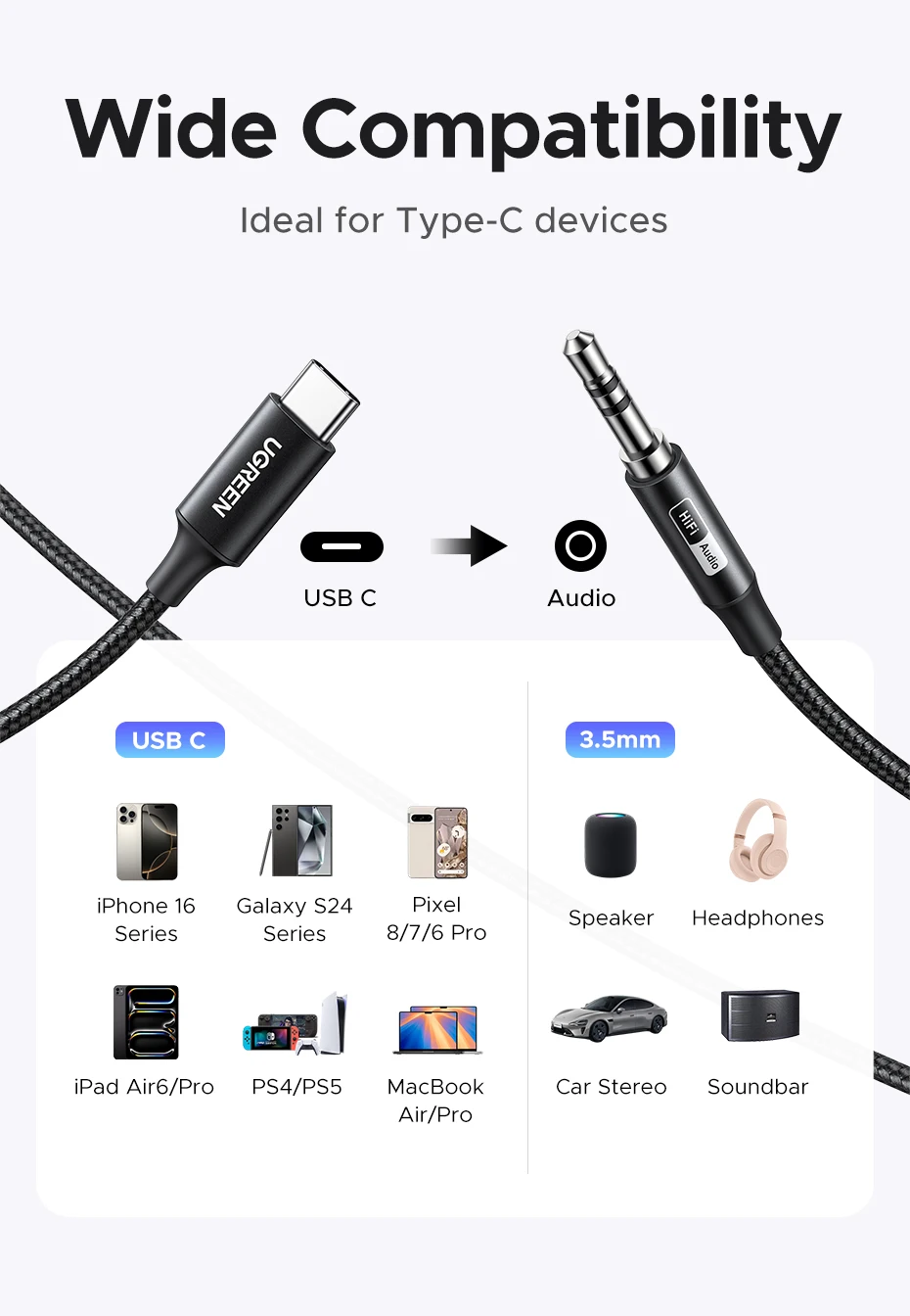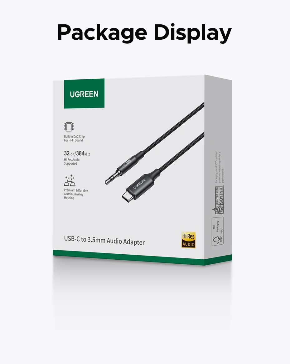 UGREEN USB C to 3.5mm Audio Aux Cable Type C 3.5 mm Headphone Male Jack Plug Adapter