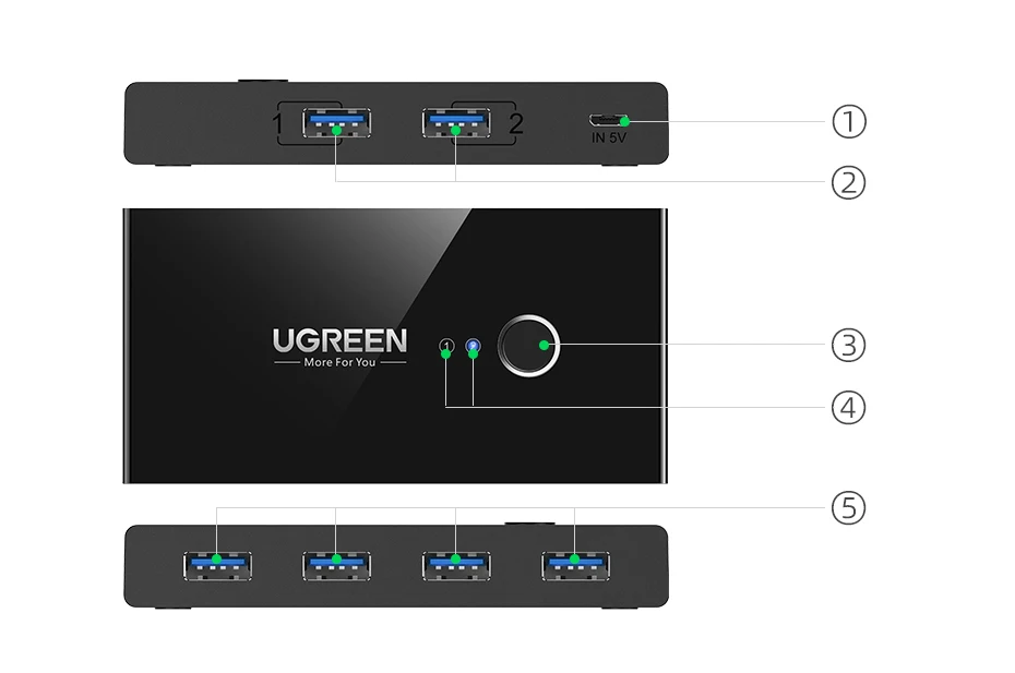①4 USB-Output port ②USB 3.0 ③Plug & Play ④LED Indicator ⑤ One Button Switch