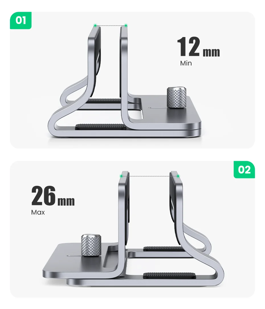 12 mm to 26 mm adjustable width makes this laptop stand highly compatible with most laptops from Macbook Air, Macbook Pro 13 16, Surface Pro, Chrombook, Dell XPS 15 up to heavy gaming laptops from Dell, HP, Lenovo, Acer, Asus, Alienware etc.