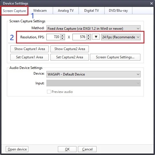 ⑦ Click “Open device” to open the capture interface