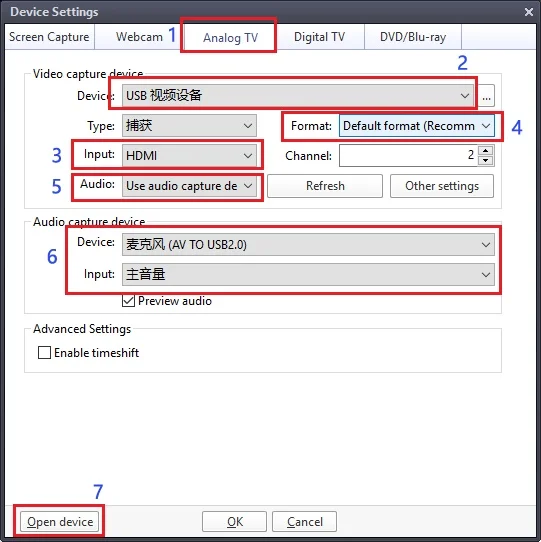 ⑥ Select Audio capture device”AV TO USB2.0″
