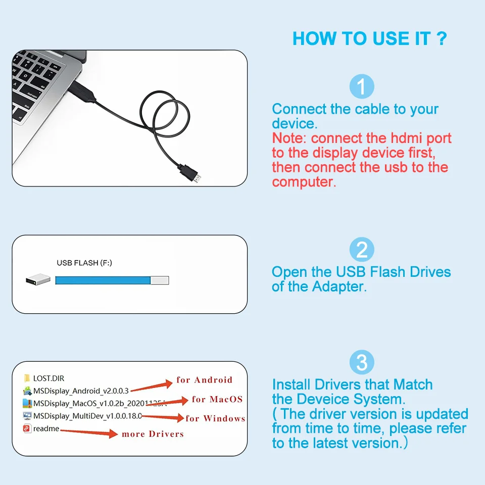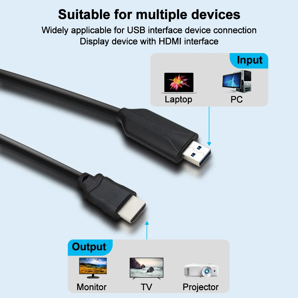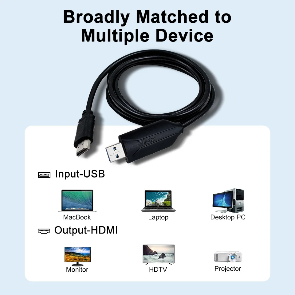 * Audio Video Adapter: USB to HDMI converter cable, audio and video synchronization. Supports USB2.0 and USB3.0, and support output 1920x1080P.