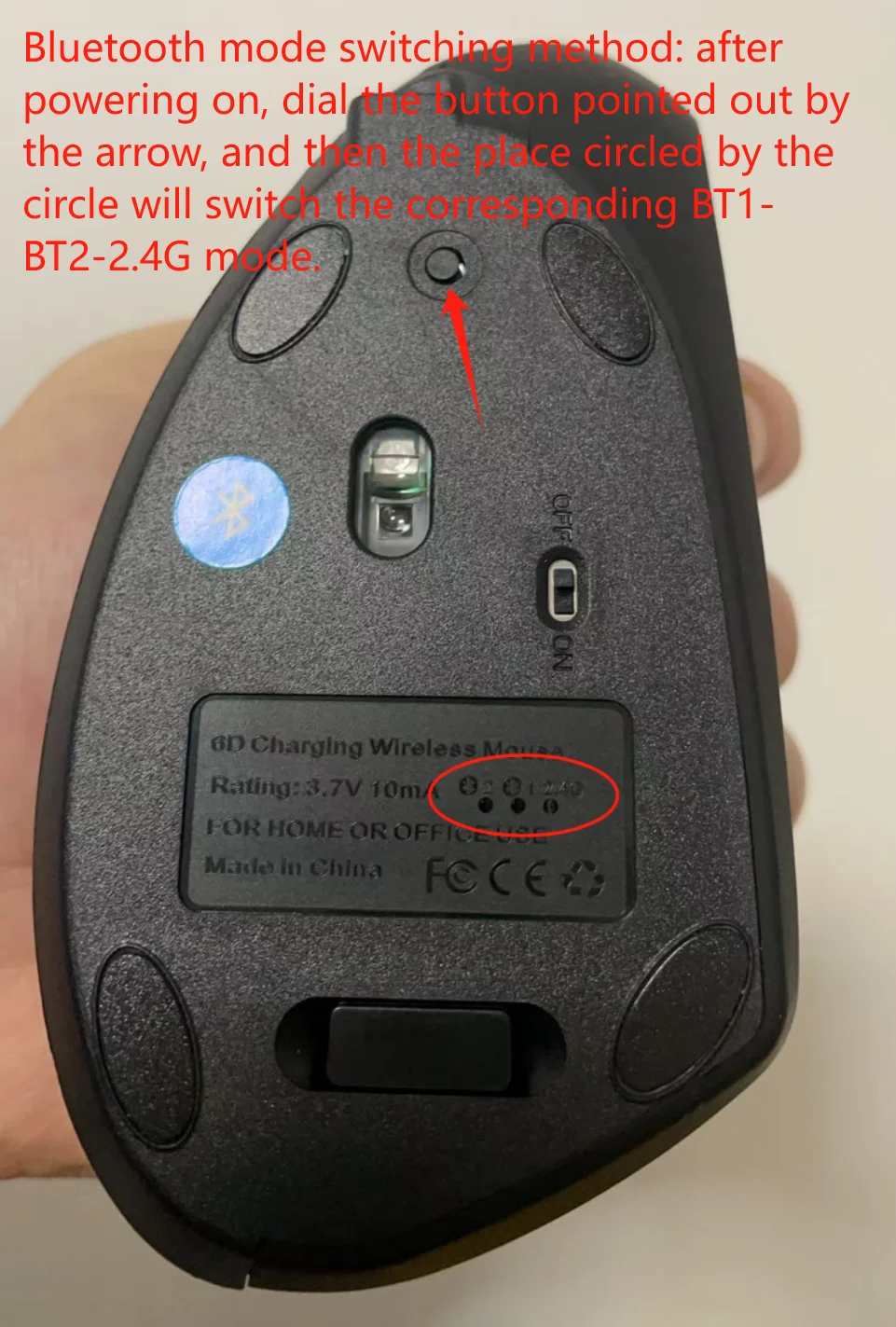 After power on, toggle the round button “●” at the bottom of the mouse, there are corresponding BT1-BT2-2.4G modes at the bottom. Toggle the round button will jump to the corresponding mode.