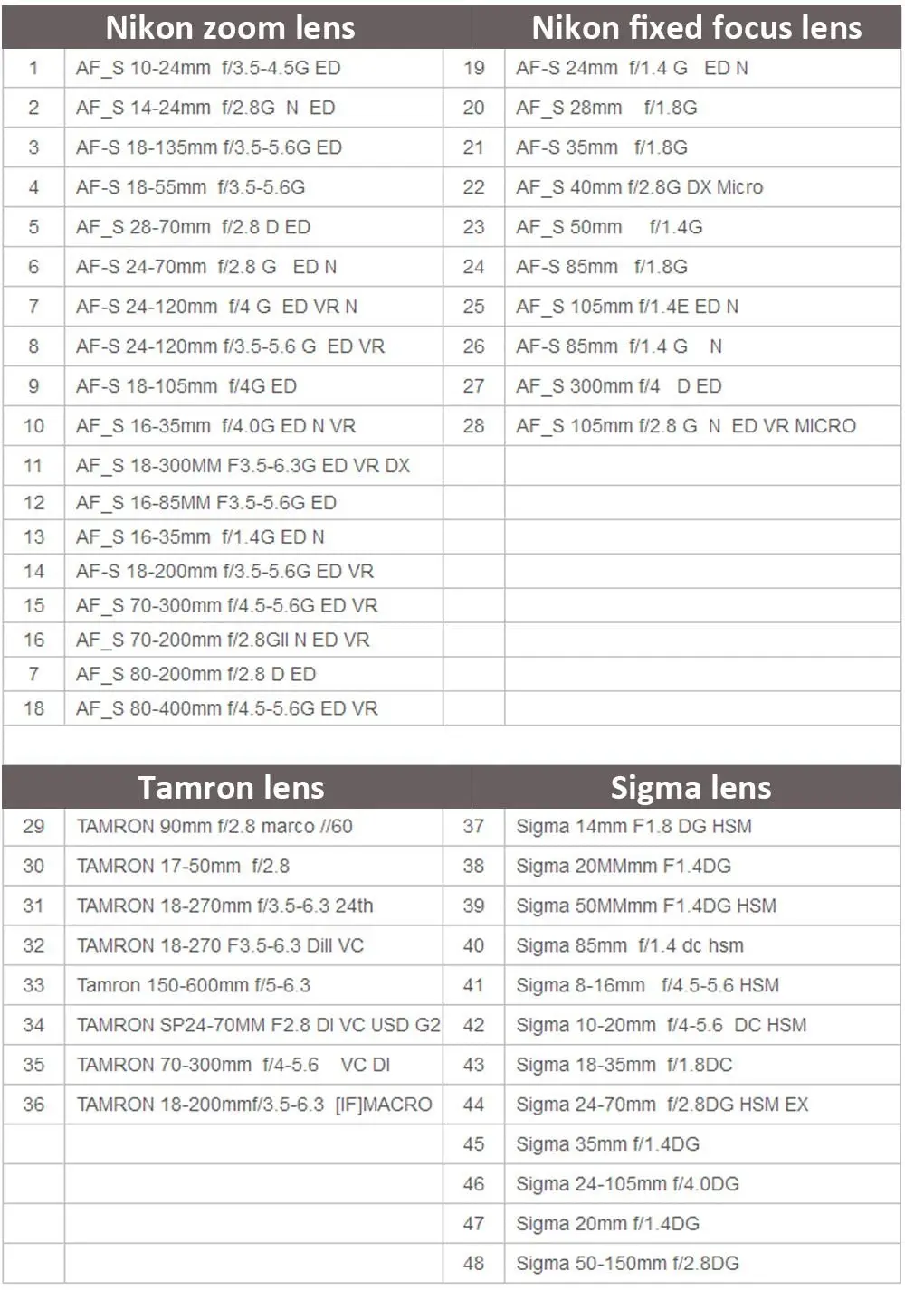 Sony E-Mount Camera: A9/A7RIII/A7RII/A7III/A7II/A6500/A6300/A6400 (only in ‘Phase Detection Focus’ mode)