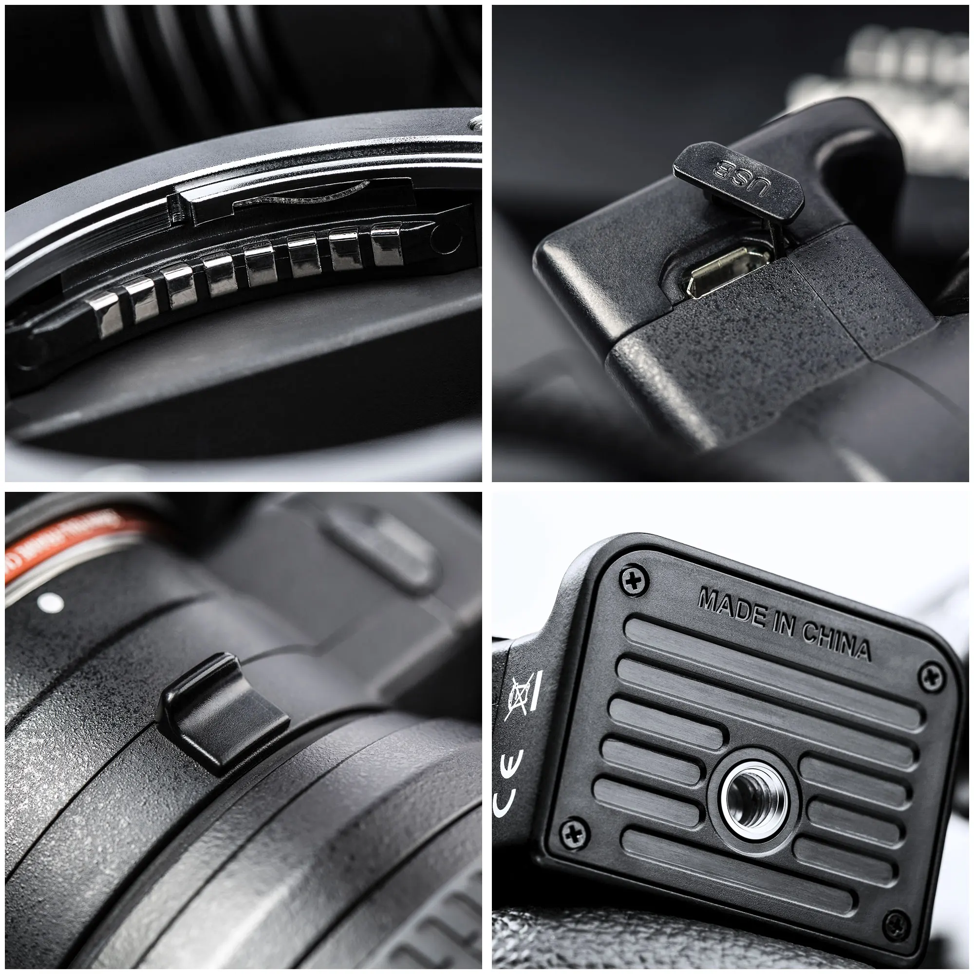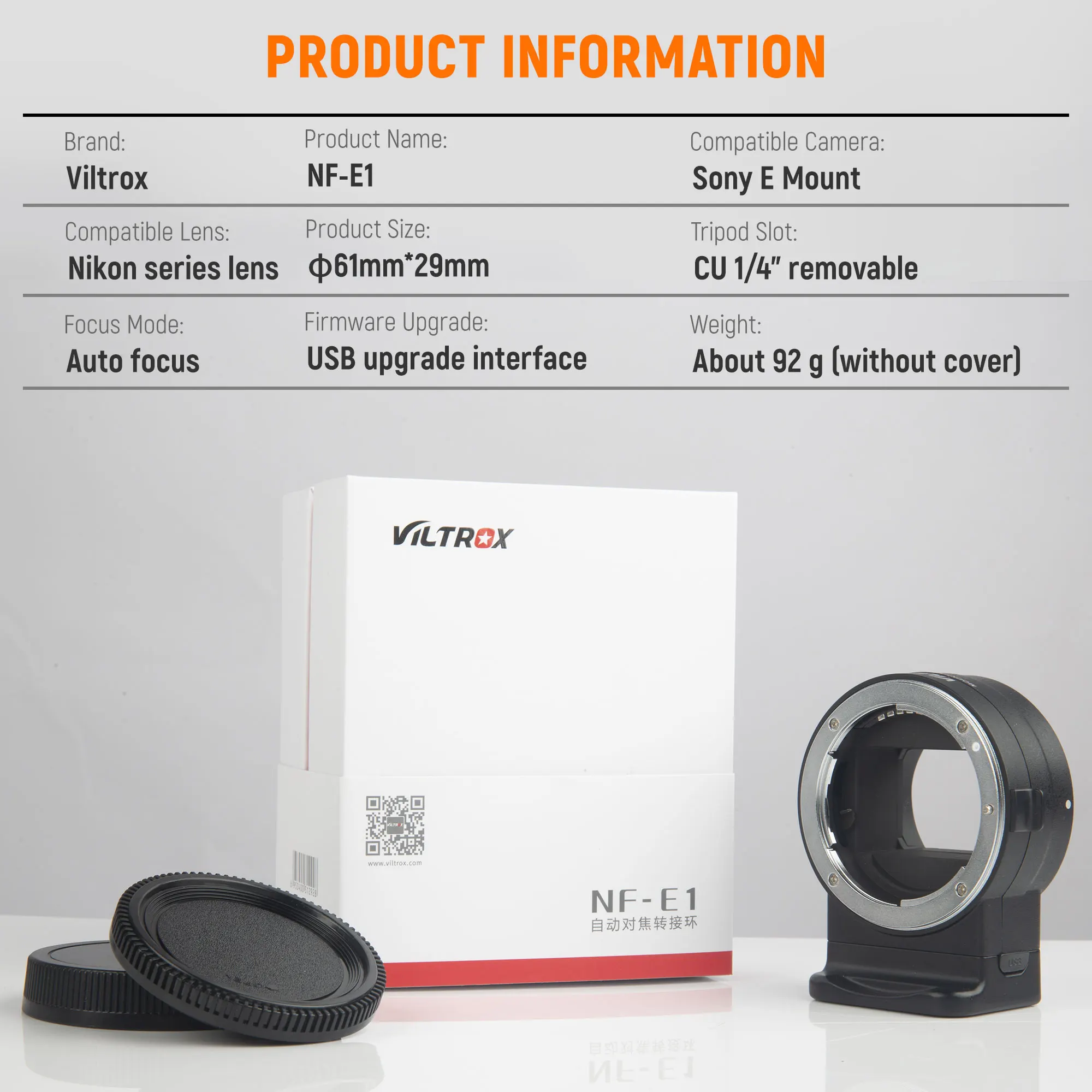 Viltrox NF-E1 electric lens mount adapter is designed for NIKON F-mount lens to compatible for SONY E-mount cameras and camcorders. It can achieve Auto Focus, aperture control, IS function and EXIF signal transmission,bringing you to a new photographic world.