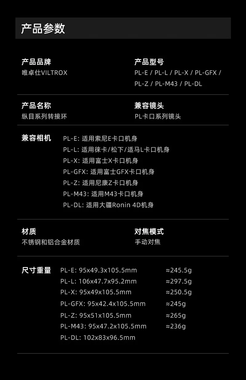 VILTROX PL Series Lens Adapter Transfer to DJI Ronin 4D Leica L Nikon Z Sony E Fuji X G Panasonic Olympus M43 Cameras