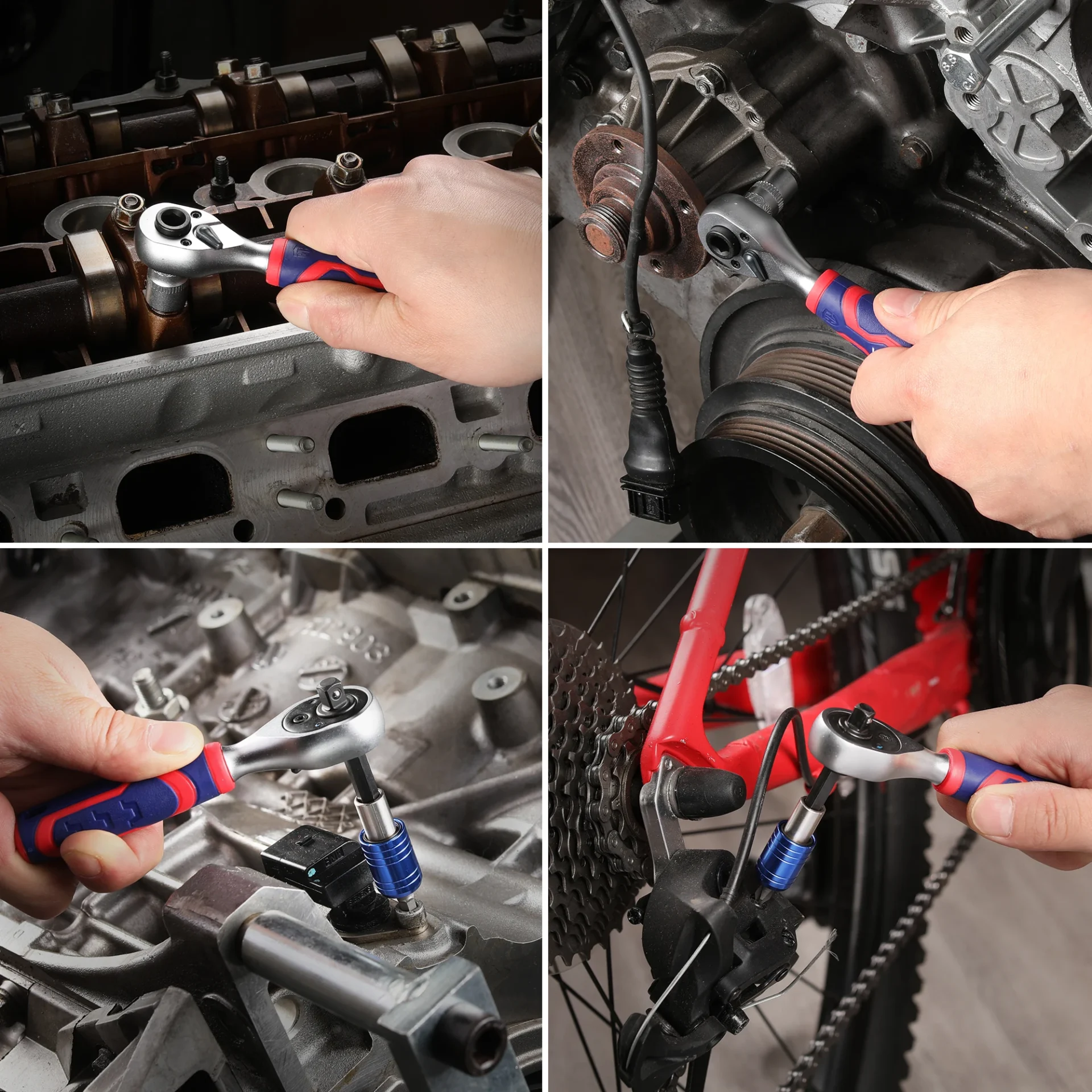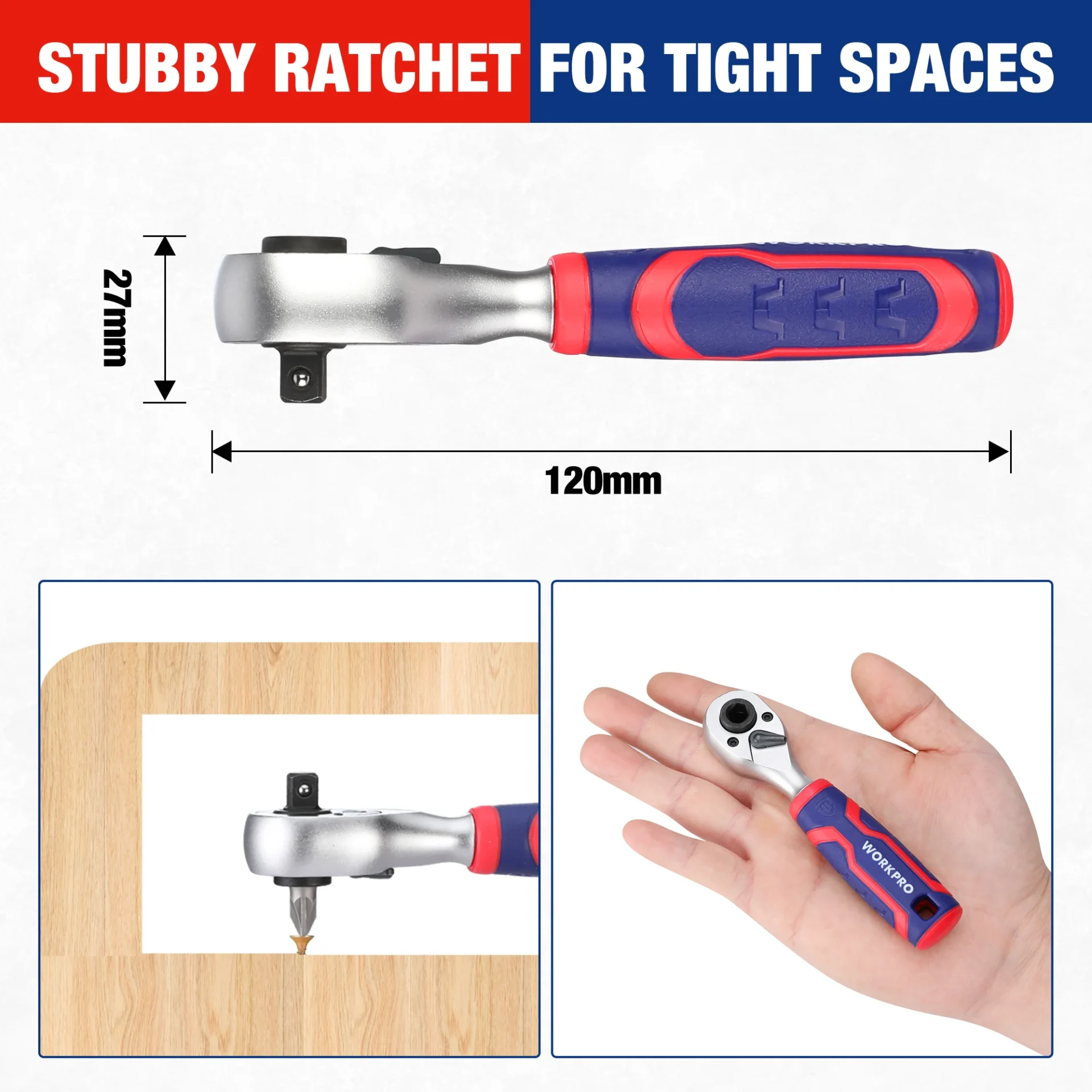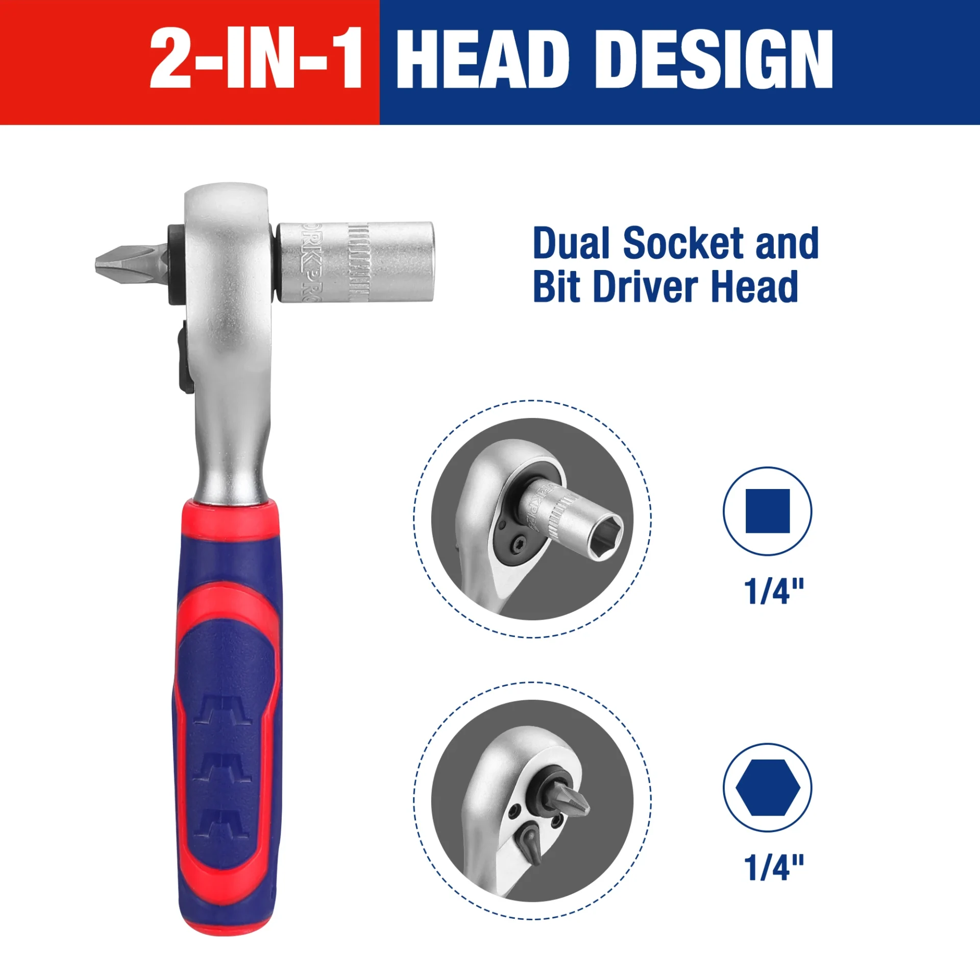• 2-in-1 Tool: The 1/4” dual drive stubby ratchet features a reversible design that drives both sockets and bits. It offers 5 degree swing arc and with a 4-3/4 inch long body allows it to work in tighter spaces. Forward/Reverse withit moves smoothly for easy direction change. Ergonomically shaped handles help reduce hand fatigue and reinforce grip.