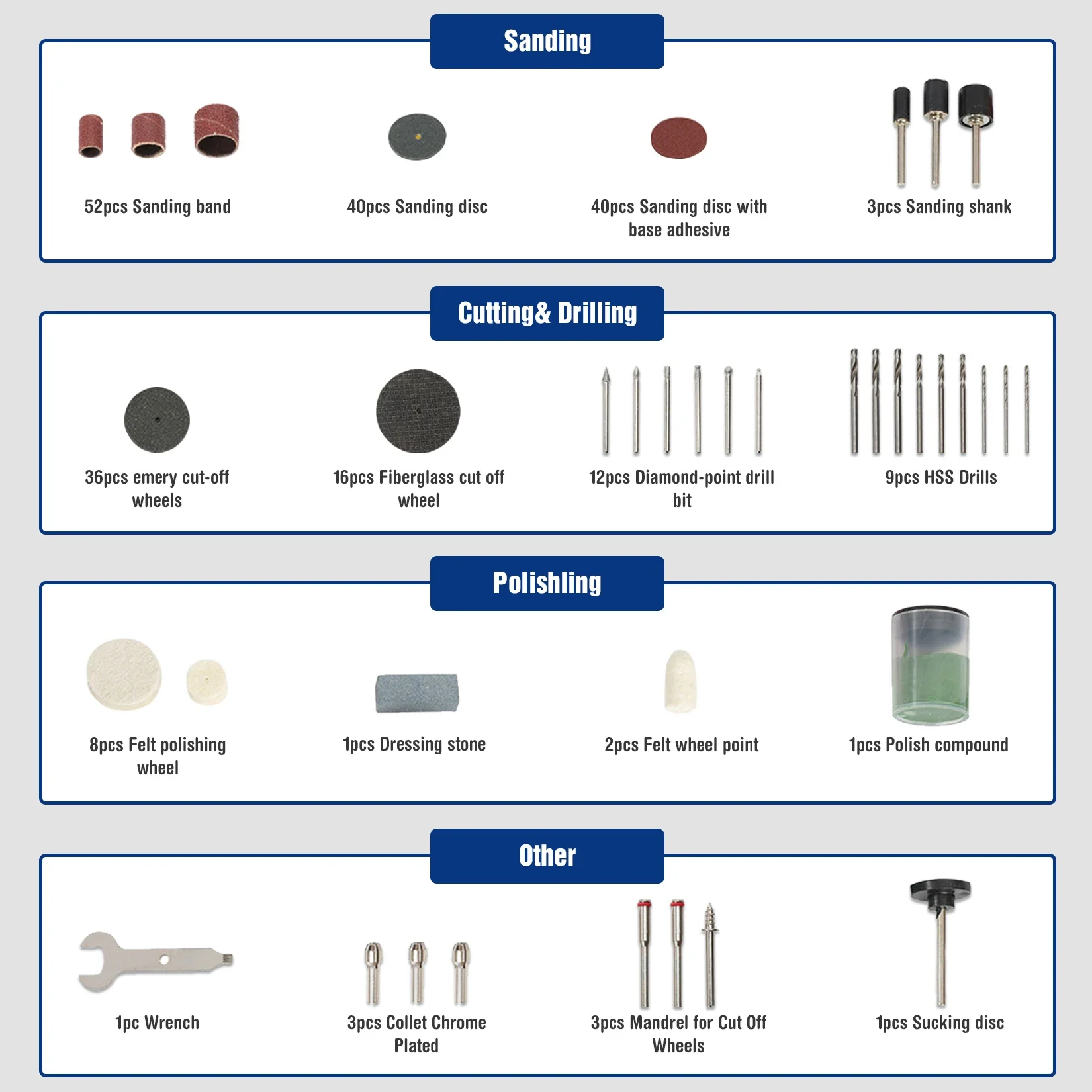 All purpose accessory for cutting, grinding,sanding, carving and polishing on variety of materials