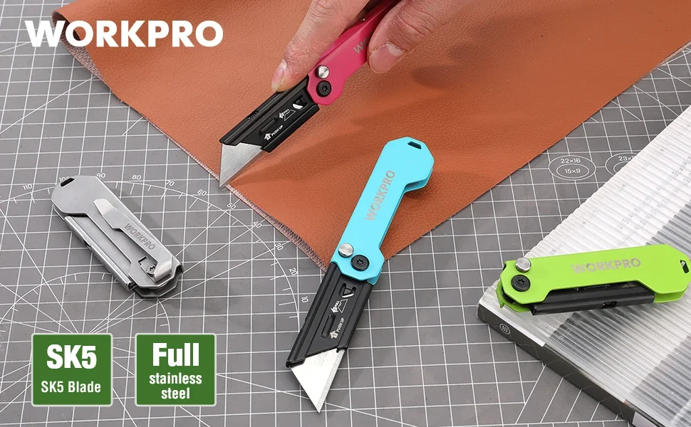 أنت تشاهد الآن:WORKPRO 3-Pack Folding Utility Knife, Razor Blade Knife Quick Change Blade Box Cutter, EDC Pocket Knife with Belt Clip