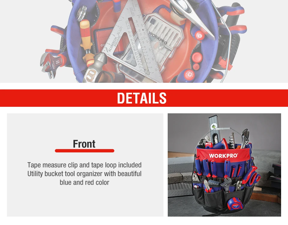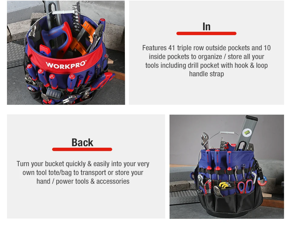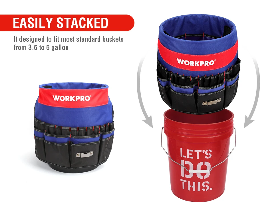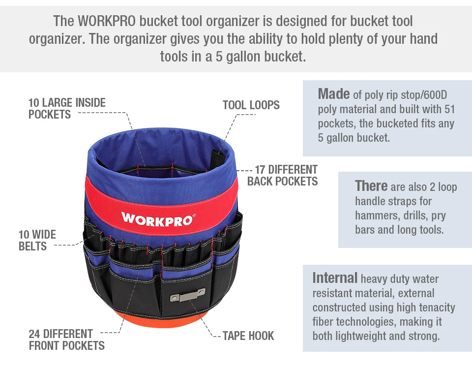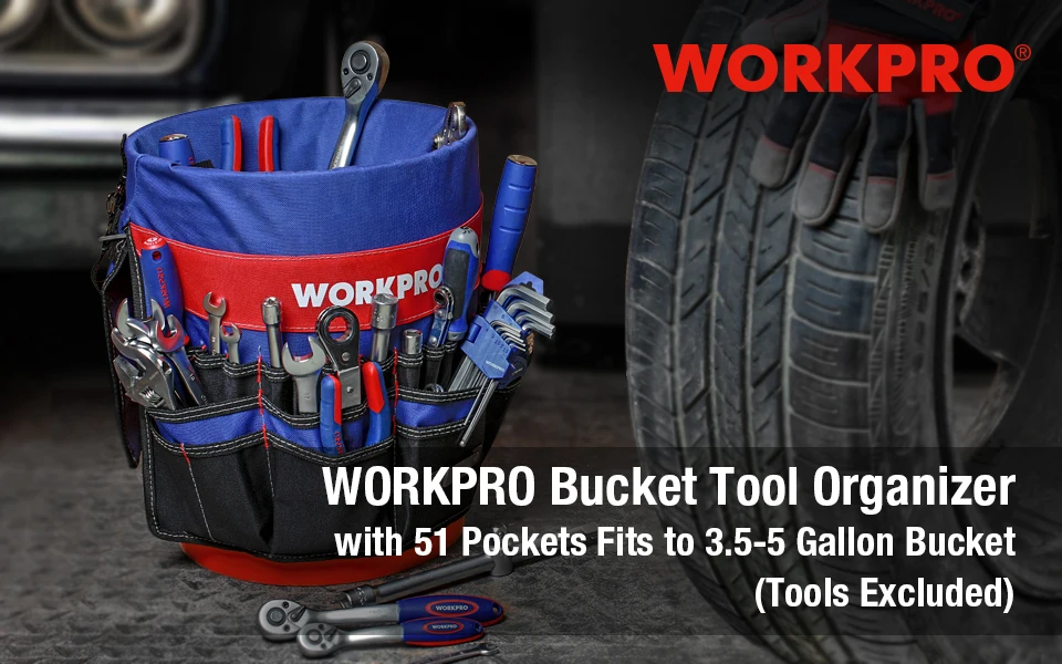 WORKPRO 5 Gallon Bucket Tool Organizer Bucket Boss Tool Bag with 51 Pockets Fits to 3.5-5 Gallon Bucket (Tools Excluded)