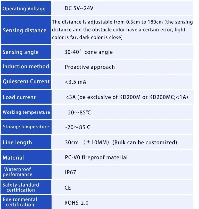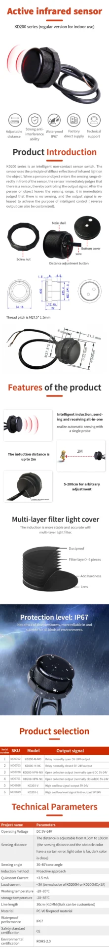 XKC-KD200X is an intelligent non-contact sensor switch. The sensor uses the principle of diffuse reflection of infrared light on the object. When a person or object enters the sensing range directly in front of the sensor, the sensor immediately judges that there is a sensor, thereby controlling the output signal ; After the person or object leaves the sensing range, it is immediately judged that there is no sensing, and the output signal is released to achieve the purpose of intelligent control (reverse output can also be customized).